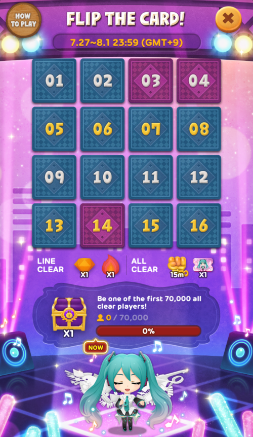 在活動期間內,以賓果遊戲方式,點選覆蓋的卡片進入活動關卡,把卡片全部翻開後即通關,通過所有關卡即可獲得獎勵!翻到幸運卡片時,也可以在過關後獲得幸運卡片獎勵。